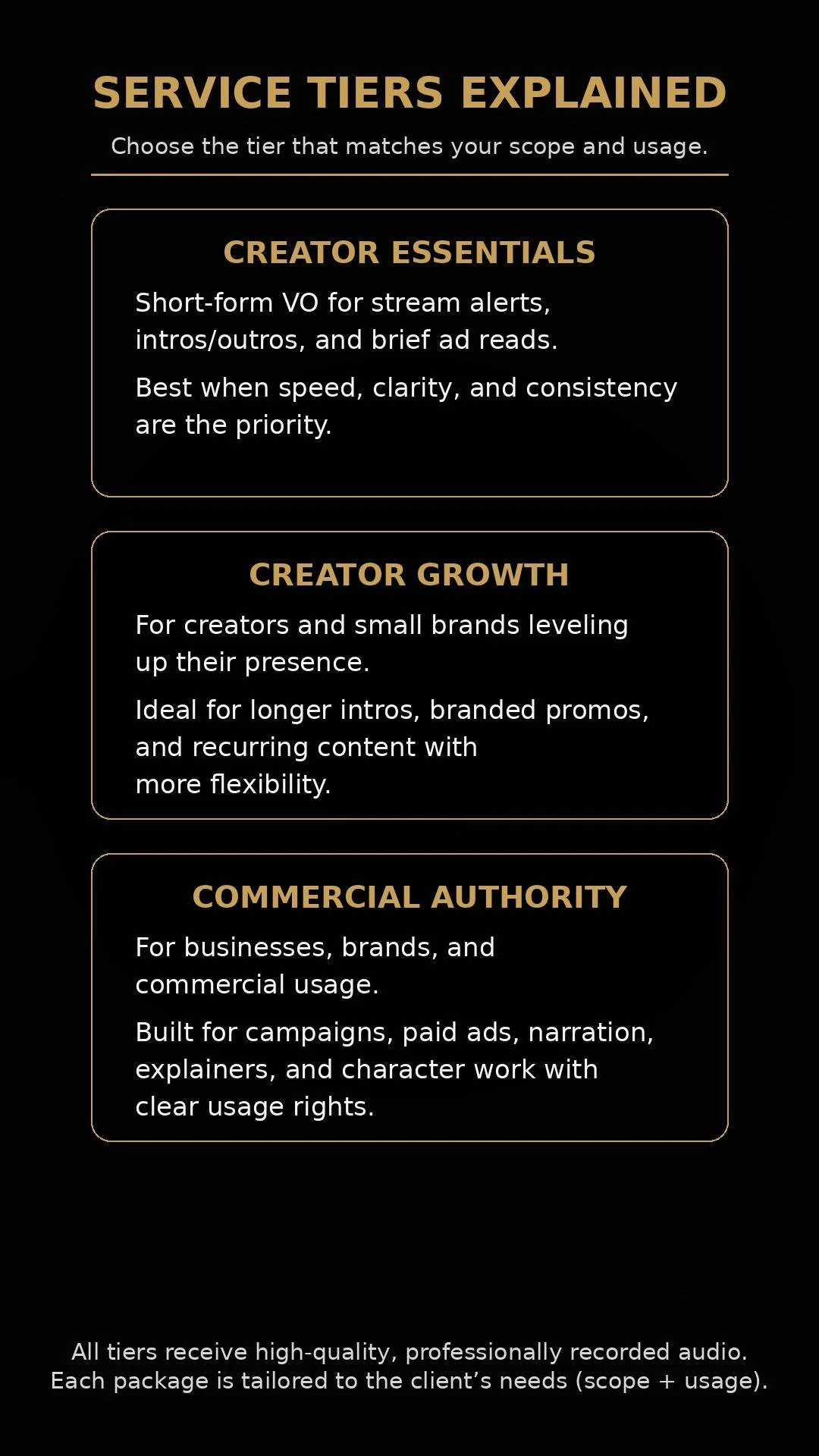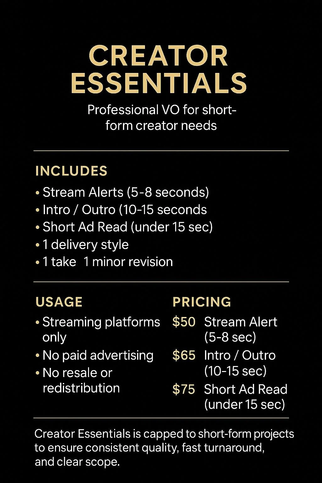 My military background taught me precision, discipline, and integrity — traits I carry into every project. Whether I’m voicing a commercial, narrating a story, or engaging my community on stream, my mission stays the same: to create meaningful connections through sound